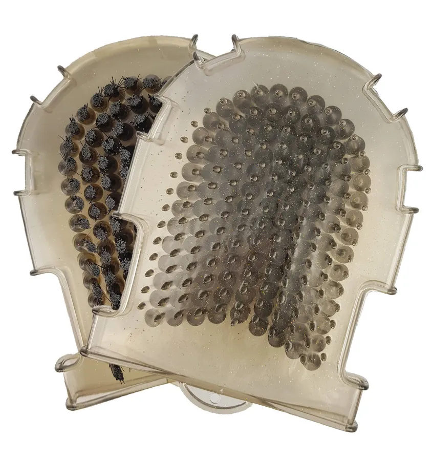 Rękawica do kąpania koni. Z jednej strony znajdują się gumowe wypustki doskonale wspomagające usuwanie wypadającej sierści. Z drugiej strony wyposażona w syntetyczne włosie świetnie czyszczące plamy. Zaopatrzona w otwór umożliwiający zawieszenie, dzięki czemu szybko można ją wysuszyć.