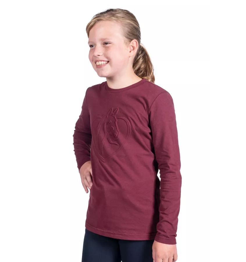 Koszulka jeździecka z długim rękawem dla dziewczynki. Wykonana z przyjaznego dla skóery materiału. Na klatce piersiowej znajduje się zdobienie z motywem głowy konia i serca. Wykonana w 95% z bawełny.