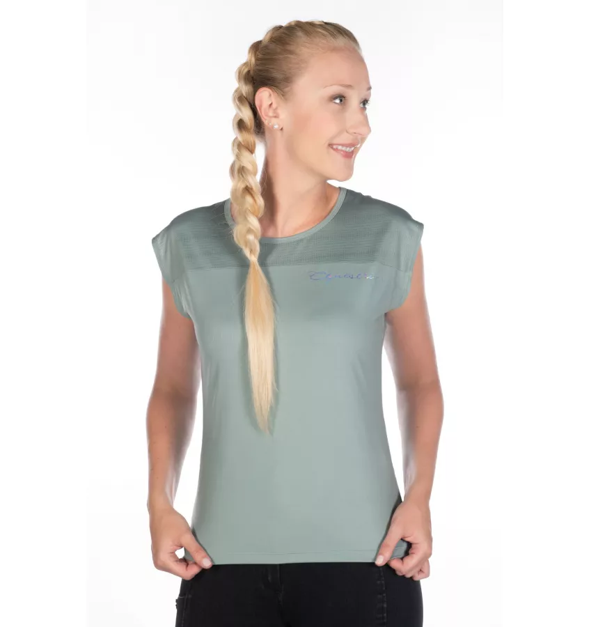 T-shirt jeździecki idealny na lato. Koszulka wykonana z szybkoschnącego materiału, który oddycha i jest elastyczny. Wstawka z tyłu oraz na ramionach została wykonana z tkaniny siateczkowej, która zapewnia dobrą cyrkulację powietrza.