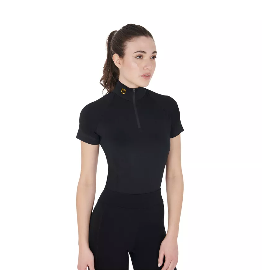 Damska koszulka jeździecka wykonana z oddychającego materiału technicznego. Gwarantuje idealne dopasowanie i całkowitą swobodę ruchów dla optymalnego komfortu. Ubranie jest ozdobione zapięciem na zamek błyskawiczny z systemem wiatroszczelnym i logo Equestro na kołnierzu.