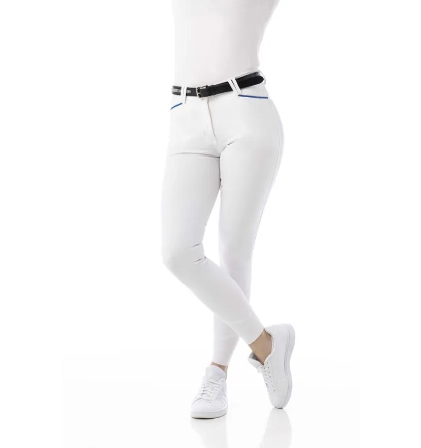 Białe bryczesy wykonane z mieszanki bawełny, zapewniającej wsparcie, wygodę i oddychalność. Idealne spodnie na każdą porę roku! Klasyczny krój. Przednie kieszenie boczne i imitacje kieszeni tylnych wykończone są trójkolorową tasiemką. Silikonowe łaty na kolanach. Elastyczne ściągacze nogawek. Skład: 60% bawełna, 33% poliamid, 7% elastan. Można prać w pralce w temperaturze 30°C.