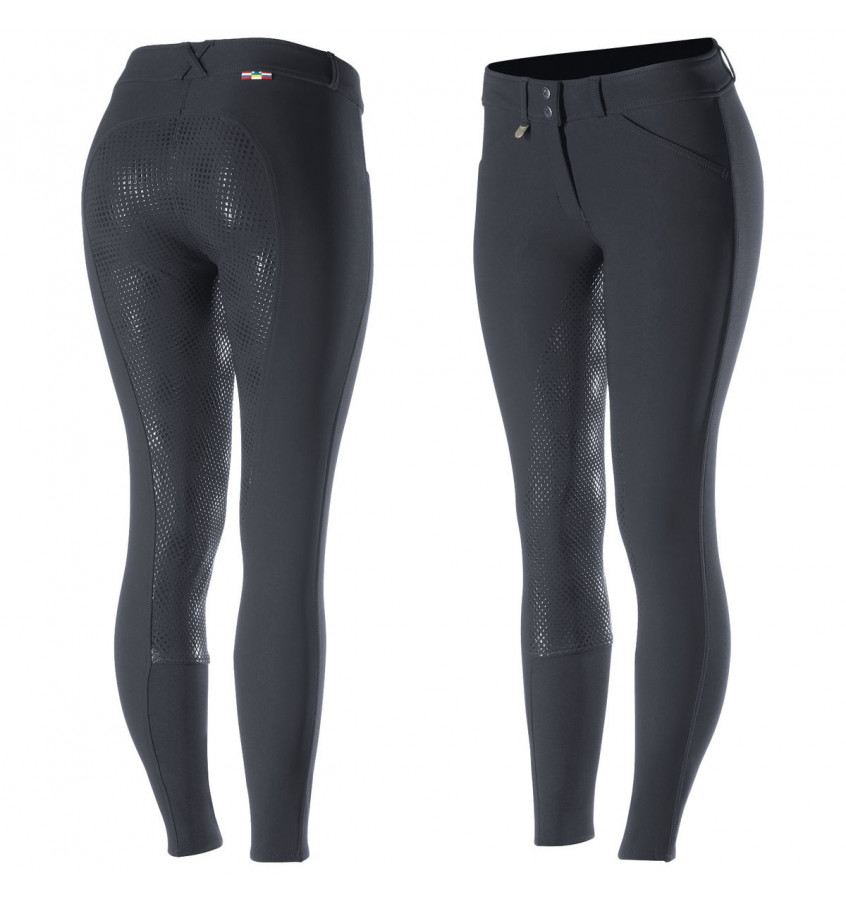Damskie bryczesy z pełnym lejem silikonowym. Dzięki elastycznemu i cienkiemu materiałowi zapewniają swobodę i komfort podczas użytkowania. Nogawki zakończone elastyczną wstawką . Bryczesy posiadają delikatnie podwyższony stan z tyłu, oraz dwie kieszenie z przodu.