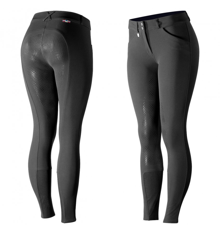 Damskie bryczesy z pełnym lejem silikonowym. Dzięki elastycznemu i cienkiemu materiałowi zapewniają swobodę i komfort podczas użytkowania. Nogawki zakończone elastyczną wstawką . Bryczesy posiadają delikatnie podwyższony stan z tyłu, oraz dwie kieszenie z przodu.