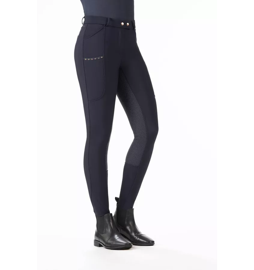 Eleganckie i klasyczne bryczesy z pełnym lejem silikonowym. Zdobione elementami w kolorze rosegold. Posiadają podszewkę z mikropolaru.