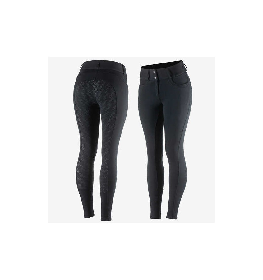 Horze z dumą przedstawia bryczesy Mia, spodnie termiczne na sezon zimowy. Funkcjonalny materiał bryczesów zapewnia ochronę przed warunkami atmosferycznymi, ciepło, elastyczność i wygodę. Właściwości termiczne w połączeniu z wodoodporną tkaniną sprawiają, że idealnie nadają się na chłodniejsze pory roku. Elastyczny pas z mocnymi szlufkami i elastyczne nogawki zapewniają wygodę i komfort. Silikonowy nadruk z pełnym siedziskiem zapewnia doskonałe wsparcie w siodle. Przednie kieszenie bryczesów zawierają dziewięć małych kryształków - ta kropelka blasku stanowi idealne wykończenie Twojego stroju.