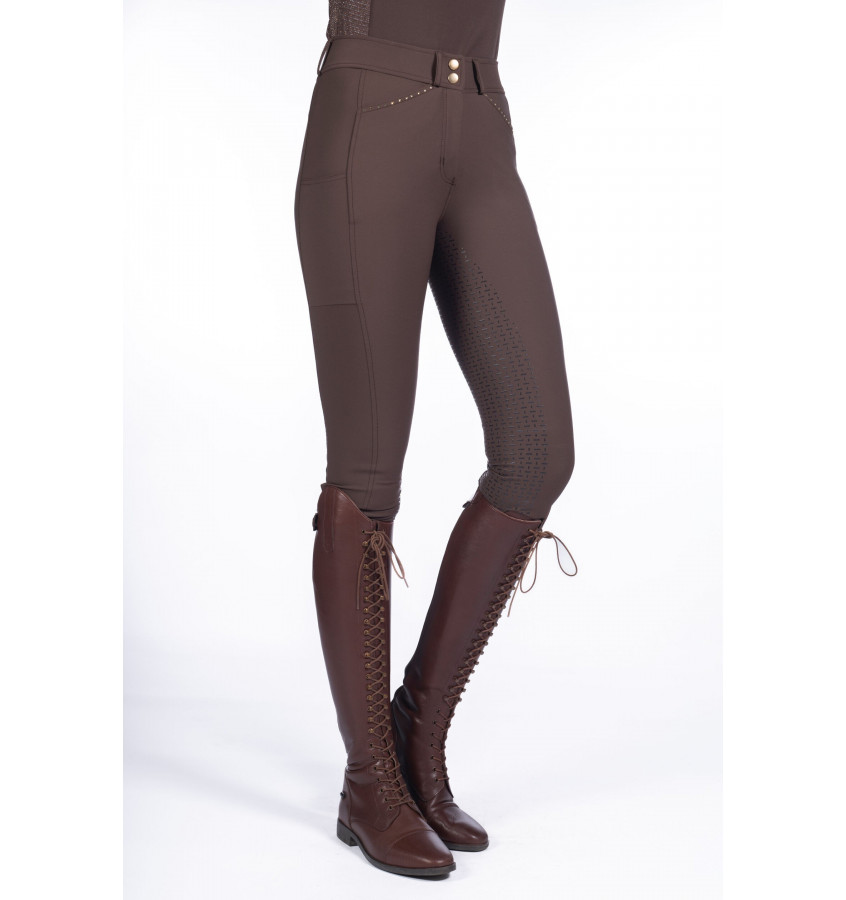 Eleganckie bryczesy z lejem silikonowym. Idealnie dopasują się do sylwetki, dzięki elastycznemu materiałowi. Zdobione małymi kryształkami. Boczna kieszeń umożliwia schowanie telefonu. Posiadają elastyczne wsawki po bokach.