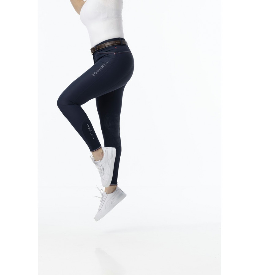 Bryczesy jeździeckie od firmy Equitheme. Wykonane z elastycznego i komfortowego w noszeniu materiału. Tkanina ma właściwości hydrofobowe, dzięki czemu nie przepuszcza łatwo wody i pozostaje ona na zewnątrz. Bryczesy wyposażone w silikonowy lej kolanowy.