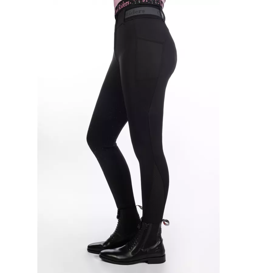 Klasyczne bryczesy jeździeckie stworzone z myślą o młodych amazonkach. Wykonane z rozciągliwego materiału, który jest przyjemny w dotyku i nie krępuje ruchów. Pełen lej silikonowy dobrze trzyma siodła. W pasie znajduje się gumka z napisem "Cool Riders" oraz szlufki na pasek. Wyposażone w boczną kieszeń na telefon.