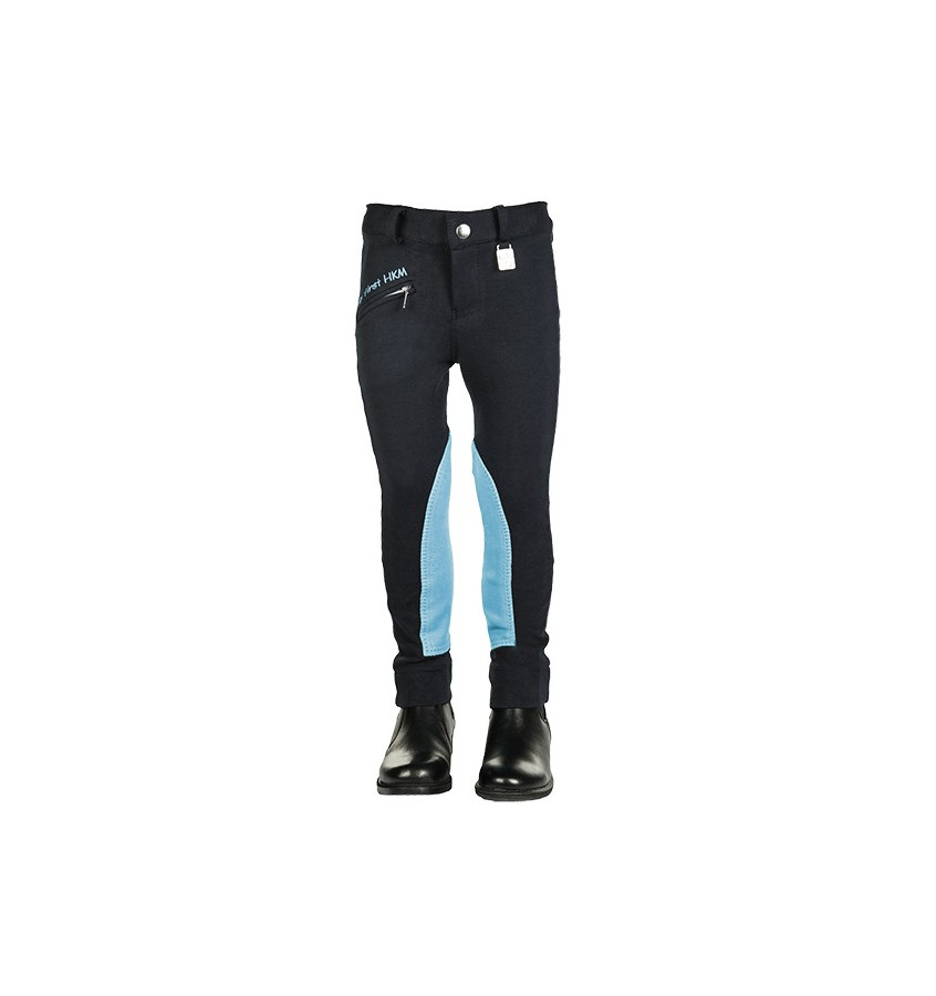 Bryczesy dziecięce z materiałowym lejem kolanowym. Posiadają regulowaną w pasie gumkę. Wykonane z materiału oddychającego, przyjaznego dla skóry, typu stretch. Wyposażone w szlufki na pasek, kieszonkę zapinaną na suwak z przodu, wszytą gumkę pod stopę.