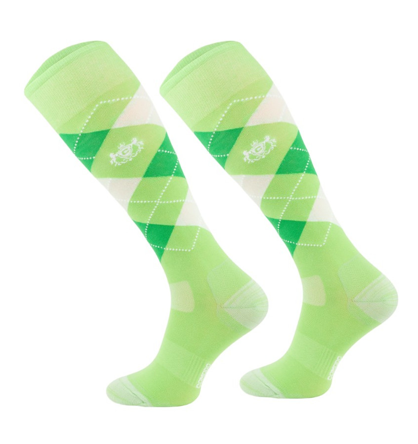 Podkolanówki jeździeckie wykonane z miękkiego materiału elastycznego. Zdobione wzorem w kratę Karo.