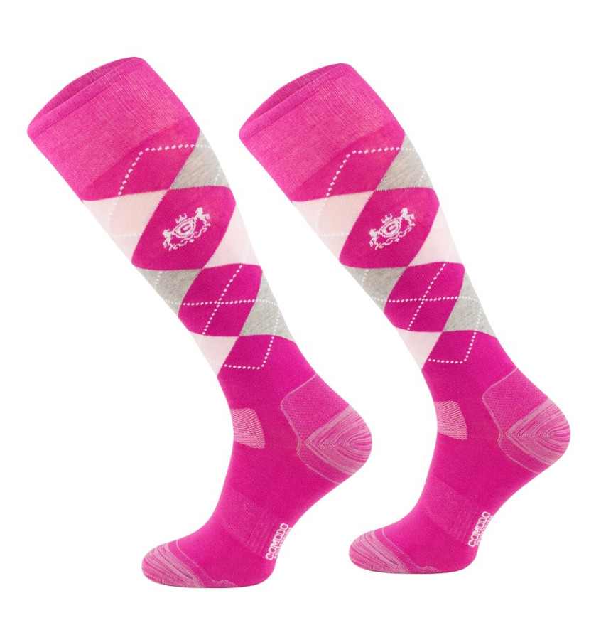 Podkolanówki jeździeckie wykonane z miękkiego materiału elastycznego. Zdobione wzorem w kratę Karo.