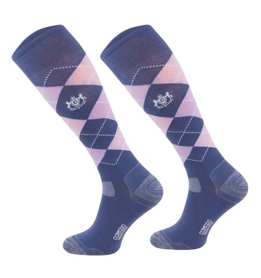 Podkolanówki jeździeckie wykonane z miękkiego materiału elastycznego. Zdobione wzorem w kratę Karo.