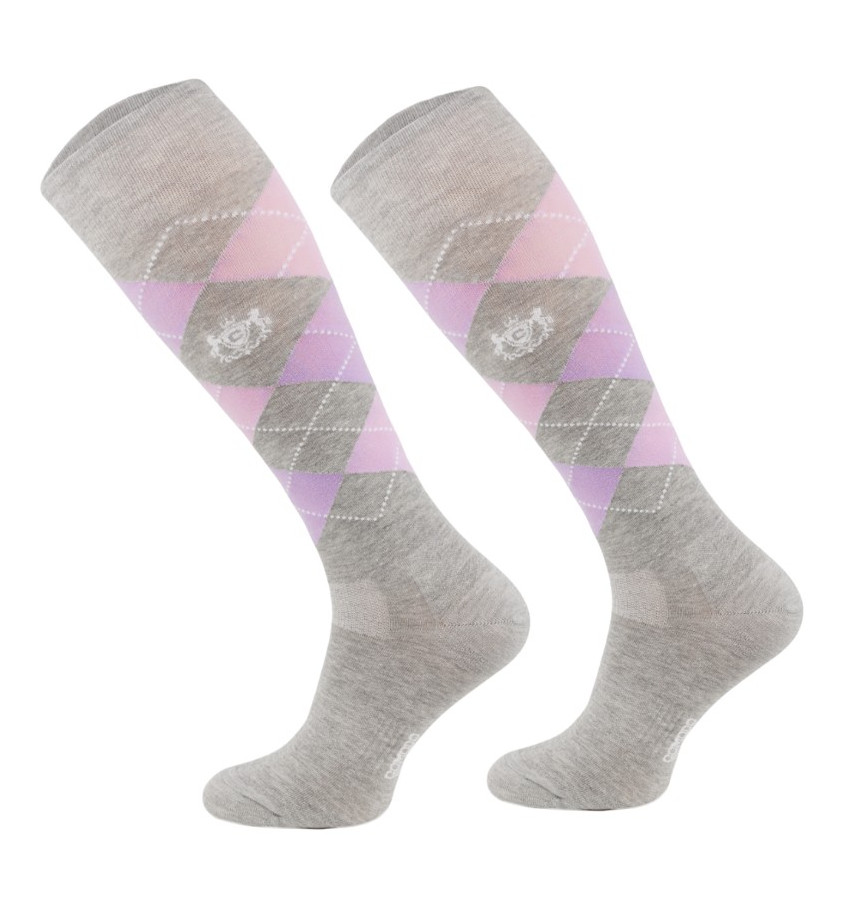 Podkolanówki jeździeckie wykonane z miękkiego materiału elastycznego. Zdobione wzorem w kratę Karo.