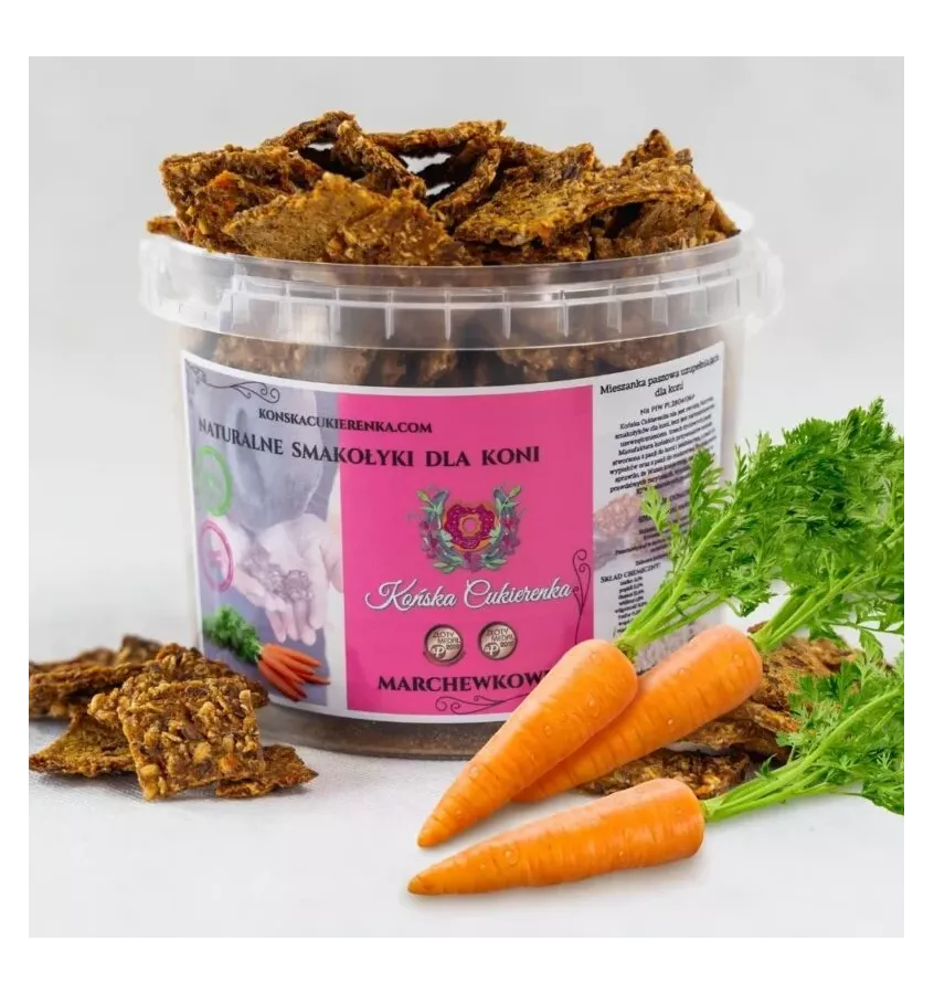 Naturalne smakołyki dla koni o smaku marchewkowym. Zdrowe, chrupiące przysmaki dla koni w formie cienkich ciasteczek. Smaczki są uwielbiane przez konie i są świetną nagrodą za dobry trening.