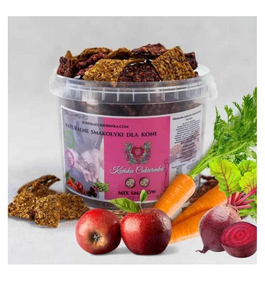 Naturalne smakołyki dla koni o smakach: marchewkowe, jabłko z cynamonem oraz buraczkowe. Zdrowe, chrupiące przysmaki dla koni w formie cienkich ciasteczek. Smaczki są uwielbiane przez konie i są świetną nagrodą za dobry trening.