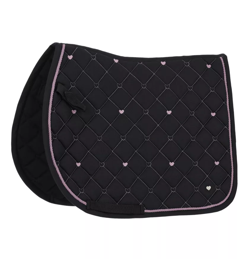 Czaprak Lize ozdobiony jest uroczymi haftowanymi serduszkami i posiada stylowy, ozdobny sznurek. Czaprak wyściełany jest chłonną siateczką, która zapewnia kucykowi suchość podczas jazdy. Dodatkowo czaprak wyposażony jest w krótkie szlufki na kółka w kształcie litery D oraz szlufki na popręg.