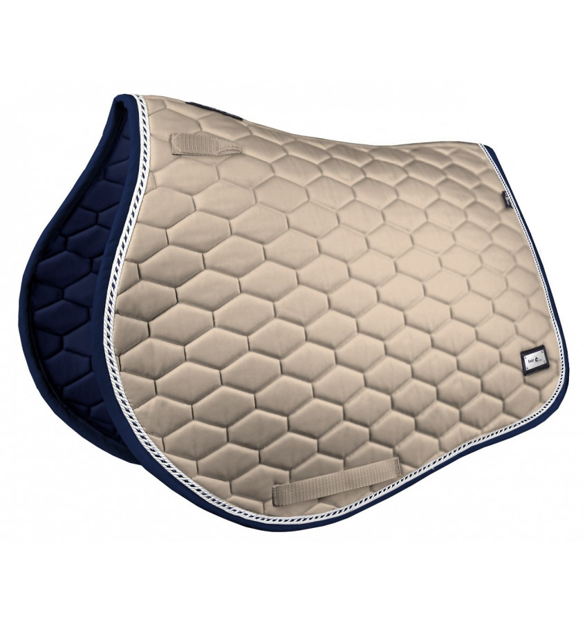 Czaprak Hexagon wykonany z wysokiej jakości materiałów. Bardzo elegancki, podszyty oddychającą i szybkoschnącą siateczkową podszewką. Posiada anatomiczny krój, który zapewnia idealne dopasowanie do grzbietu konia zapewniając mu maksymalny komfort. Delikatnie pikowany oraz ozdobiony kontrastową lamówką. Wyposażony w paski do przystuł oraz pasek na popręg. Prosty w utrzymaniu czystości.