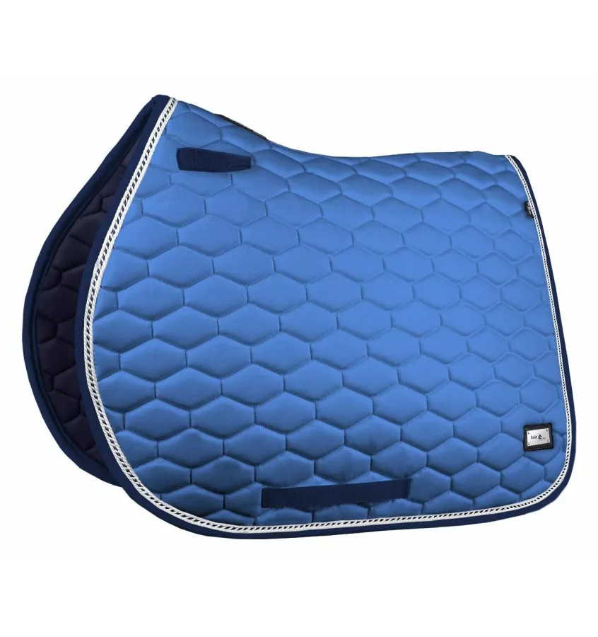 Czaprak Hexagon wykonany z wysokiej jakości materiałów. Bardzo elegancki, podszyty oddychającą i szybkoschnącą siateczkową podszewką. Posiada anatomiczny krój, który zapewnia idealne dopasowanie do grzbietu konia zapewniając mu maksymalny komfort. Delikatnie pikowany oraz ozdobiony kontrastową lamówką. Wyposażony w paski do przystuł oraz pasek na popręg. Prosty w utrzymaniu czystości.