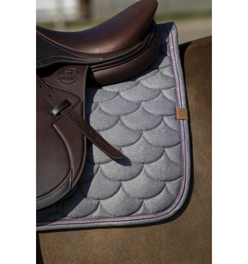 Czaprak pikowany na wzór łuski. Wypełniony 200g/m2 polyfill oraz 8mm grubą pianką. Zdobiony kryształkami na obrzeżach.