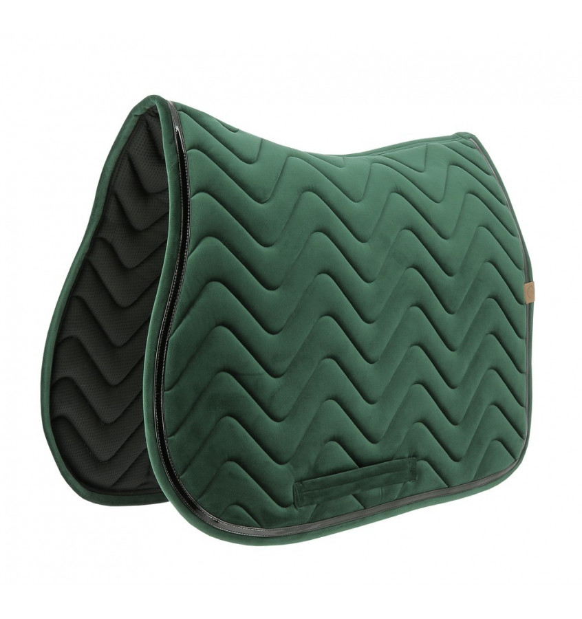 Czaprak o aksamitnym welurowym wykończeniu. Wypełnienie 200g/m2 polyfill. Zdobony lakierowaną lamówką.