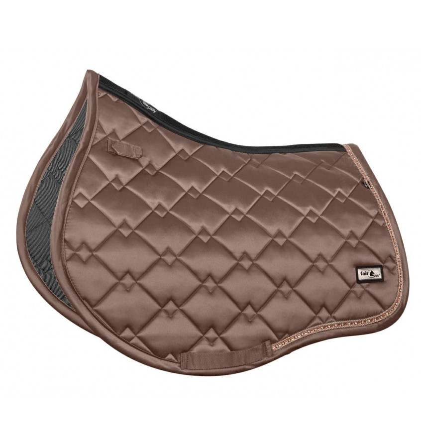 Najwyższej jakości, atrakcyjnie przepikowany czaprak wykonany z atłasu. Ozdobiony podwójnym, połyskującym sznurkiem i biżuteryjną taśmą w kolorze różowego złota. Linia grzbietu wykonana z siatki 3D air mesh dla lepszej cyrkulacji powietrza. Podszyty miękkim materiałem poliestrowym z domieszką specjalnych włókien ceramicznych - CERAMIC-tech™, które zapewniają lepsze ukrwienie oraz działaja rozlużniająco na mięśnie.