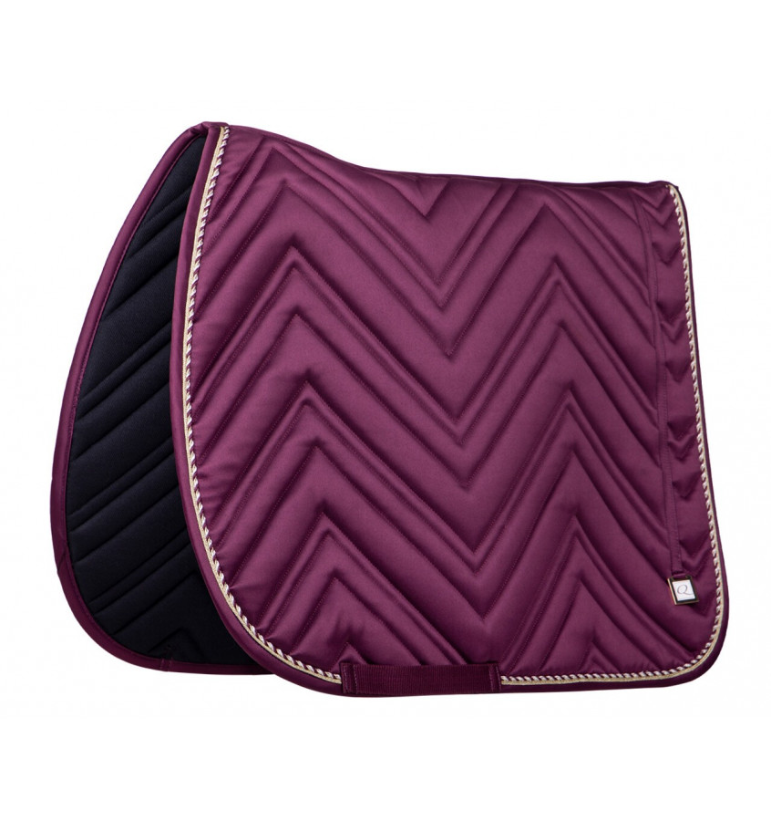 Czaprak pod siodło z limitowanej kolekcji QHP Menton. Wykonany z połyskującego materiału. Niestandardowe i wyjątkowe pikowanie. Zdobiony trzykolorową lamówką oraz znaczkiem Q.  Podszyty siateczką, która absorbuje pot. Anatomiczny kształt. 100% poliester
