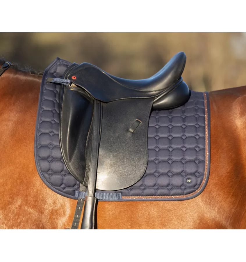 Elegancki czaprak z brokatową lamówką i anatomicznie ukształtowanym grzbietem. Czaprak posiada pętle na popręg i krótkie pętle do siodła z zapięciem na rzepy, które zapewniają, że czaprak pozostaje na swoim miejscu. Podszyty materiałem, który odprowadza wilgoć na zewnątrz.
