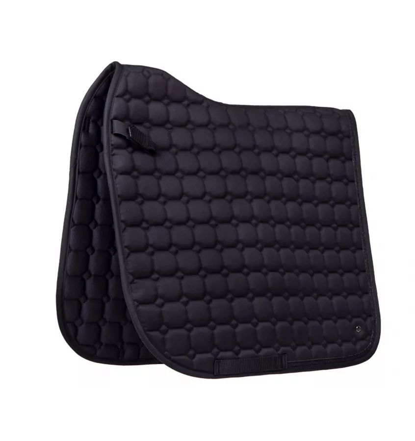 Elegancki czaprak z brokatową lamówką i anatomicznie ukształtowanym grzbietem. Czaprak posiada pętle na popręg i krótkie pętle do siodła z zapięciem na rzepy, które zapewniają, że czaprak pozostaje na swoim miejscu. Podszyty materiałem, który odprowadza wilgoć na zewnątrz.