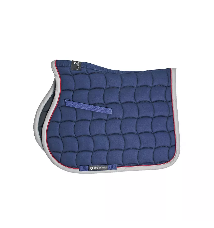 Czaprak skokowy wykonany z bawełny, dzięki czemu nadaje się na każdą porę roku, zapewniając jednocześnie doskonałą oddychalność. Lekka wyściółka zapewnia efektywne rozłożenie ciężaru na grzbiecie konia. Czaprak został wykonany zgodnie z anatomicznym kształtem zwierzęcia. Łagodzi wszelkiego rodzaju dyskomfort, a przede wszystkim zapewnia brak ucisku i tarcia na kłębie. Czaprak ozdobiony kontrastową lamówką w różnych kolorach oraz naszywką z logo Equestro i napisem na kłębie.