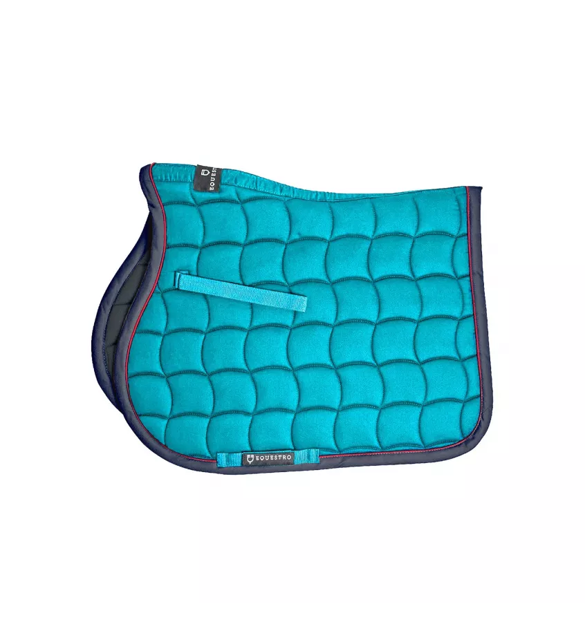 Czaprak skokowy wykonany z bawełny, dzięki czemu nadaje się na każdą porę roku, zapewniając jednocześnie doskonałą oddychalność. Lekka wyściółka zapewnia efektywne rozłożenie ciężaru na grzbiecie konia. Czaprak został wykonany zgodnie z anatomicznym kształtem zwierzęcia. Łagodzi wszelkiego rodzaju dyskomfort, a przede wszystkim zapewnia brak ucisku i tarcia na kłębie. Czaprak ozdobiony kontrastową lamówką w różnych kolorach oraz naszywką z logo Equestro i napisem na kłębie.