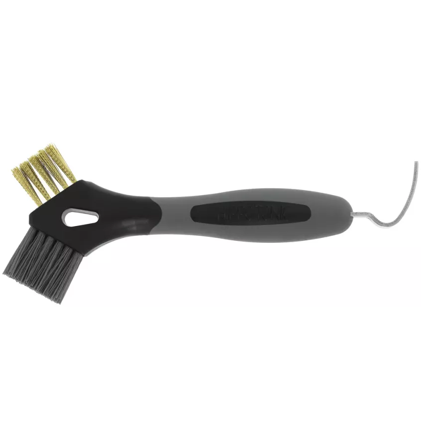 Kopystka, dzięki której dokładne wyczyścisz kopyta. - Druciana szczotka: Idealna do usuwania uporczywych cząstek i osadzającego się brudu na podeszwie kopyta. - Szczotka poliestrowa: Idealna do delikatniejszego czyszczenia, odpowiednia do wrażliwych obszarów kopyt. - Stalowy hak