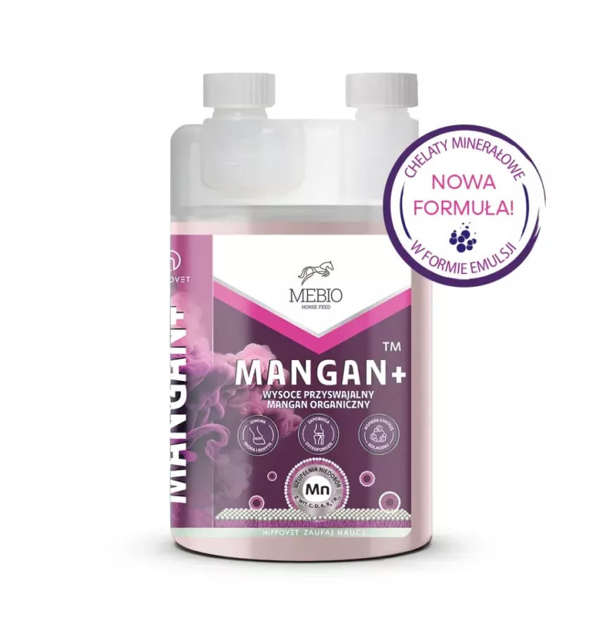 MANGAN+ wpływa na przemiany energetyczne oraz syntezę kolagenu niezbędnego dla zdrowia układu kostnego i utrzymania struktury tkanek łącznych. Szczególnie istotny u koni rosnących ponieważ bierze udział w procesach mineralizacji tkanki kostnej. Wspomaga procesy reprodukcyjne, a także poprawia pigmentację skóry i sierści. Przeciwdziała uszkodzeniom komórek poprzez działanie antyoksydacyjne.