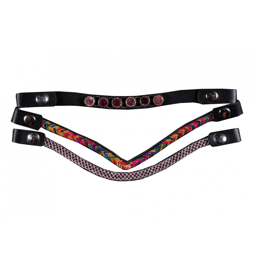 Zestaw 3 naczółków ozdobny do ogłowia hobby horse. Łatwe zapinanie za pomocą zatrzasków. Imitacja skóry.