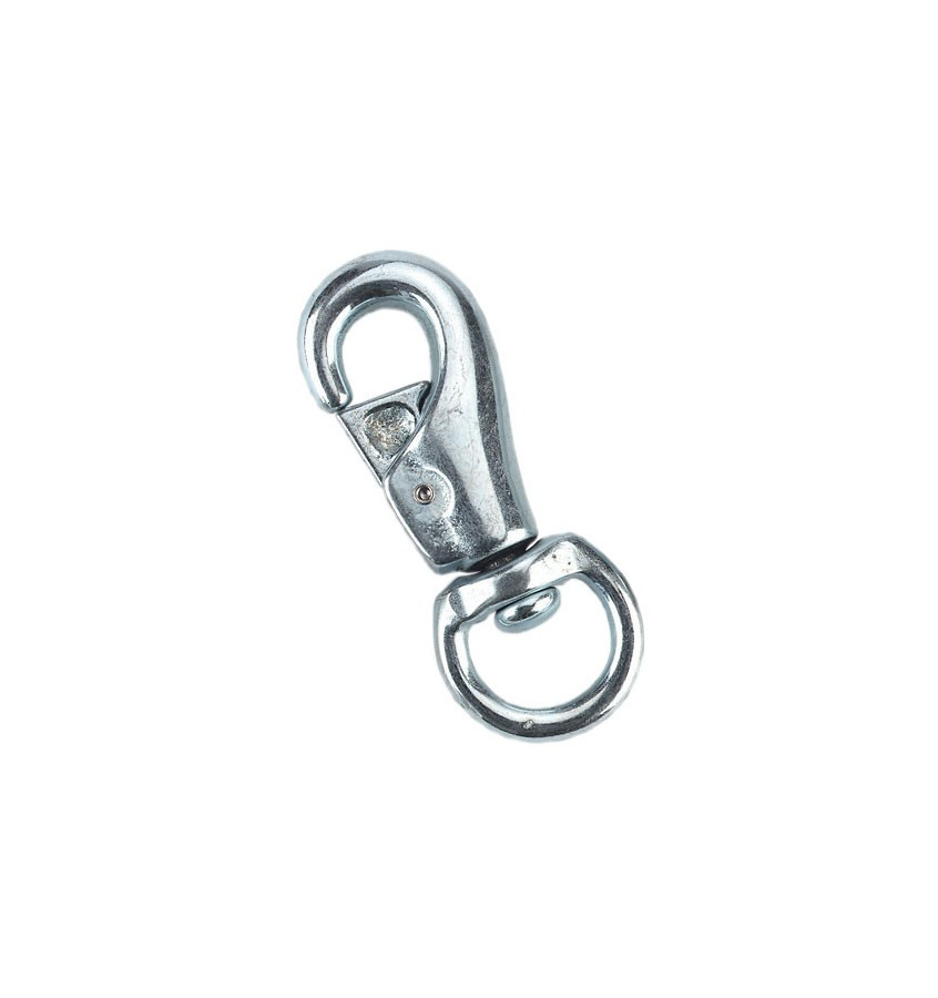 Ciężki karabińczyk do uwiązu, ocynkowany, z okrągłym obiegiem. Trudny do odpięcia.