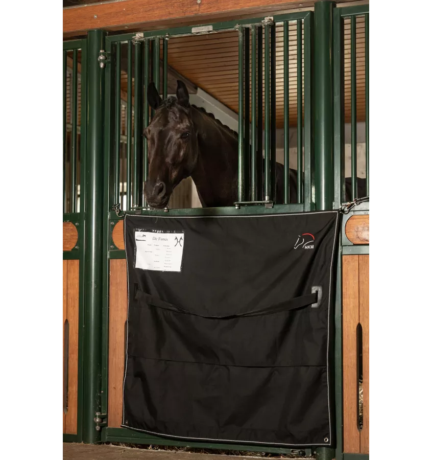 Wytrzymała kurtyna na boks z prostym mocowaniem na dwa pierścienie i dwa nylonowe paski z karabińczykami. Przezroczyste okienko na z kartkę z informacjami o koniu. Wyposażona w pas na środku, który służy do przewieszenia podkładki czy czapraka.