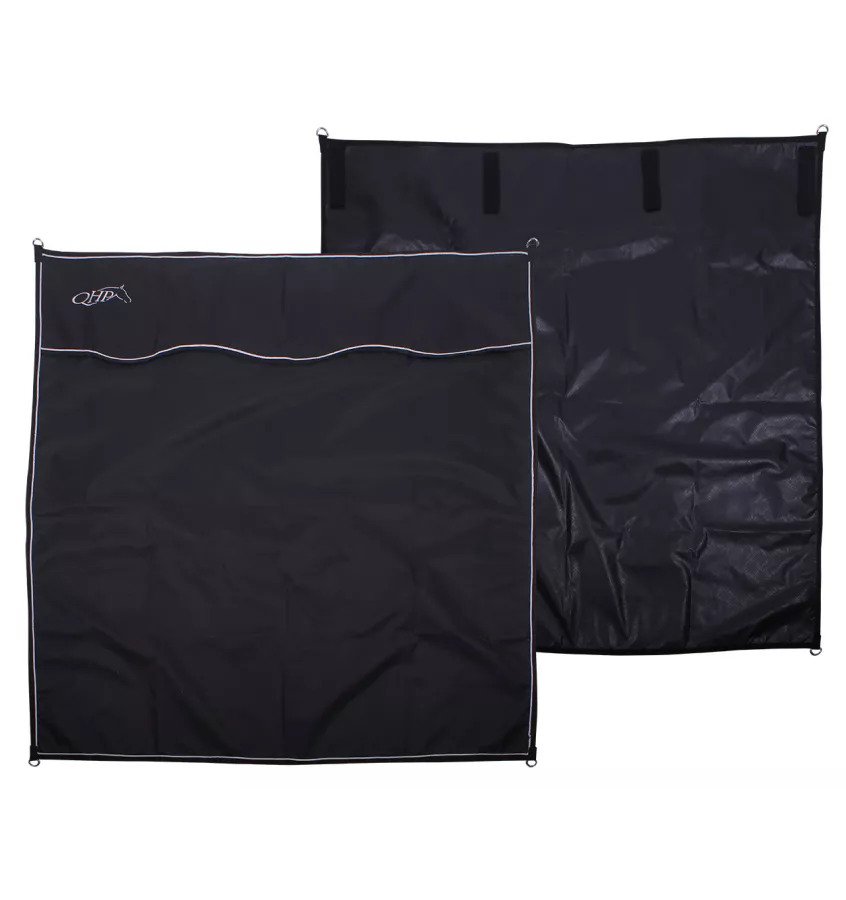 Zaslona na boks to idealne rozwiązanie dla koni podatnych na stres związanym z obcymi końmi w stajni podczas zawodów. Kurtyna blokuje większość bodźców z otoczenia. Zasłonę można przymocować za pomocą czterech szerokich rzepów i czterech kółek typu D. Zasłona do stajni wykonana z wodoodpornego materiału hydrofobowego
