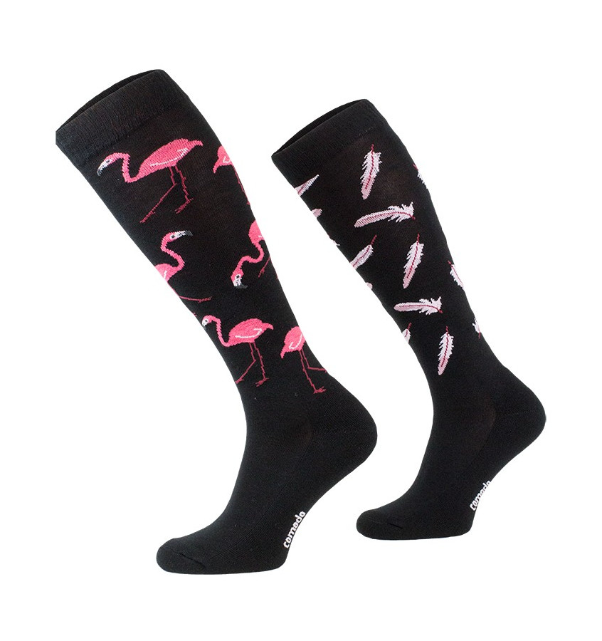 Podkolanówki jeździeckie wykonane z najwyższej jakości bawełny z dodatkiem włókien elastycznych. Ściągacz w śródstopiu utrzymuje skarpetę na miejscu. Posiadają wzmacnianą stopę frotte oraz nieuciskający ściągacz. Jedna podkolanówka jest z różowymi flamingami, druga z piórkami.