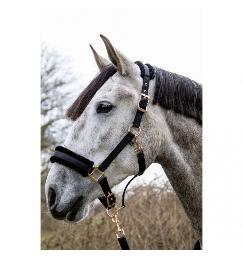 Kantar podszyty futerkiem na potylicy i części nosowej. Stabilne sprzączki w kolorze rosegold. Potrójna regulacja.