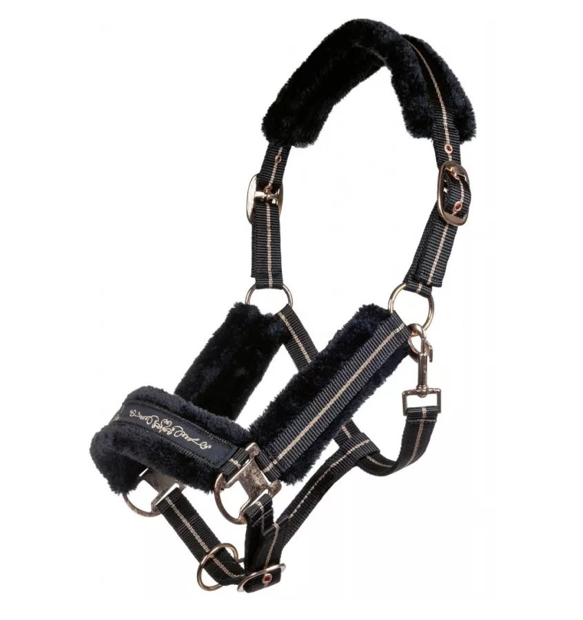 Kantar podszyty futerkiem ze wstawkami oraz okuciami w kolorze rosegold. Posiada 3 możliwości regulacji. Część potyliczna regulowana obustronnie.