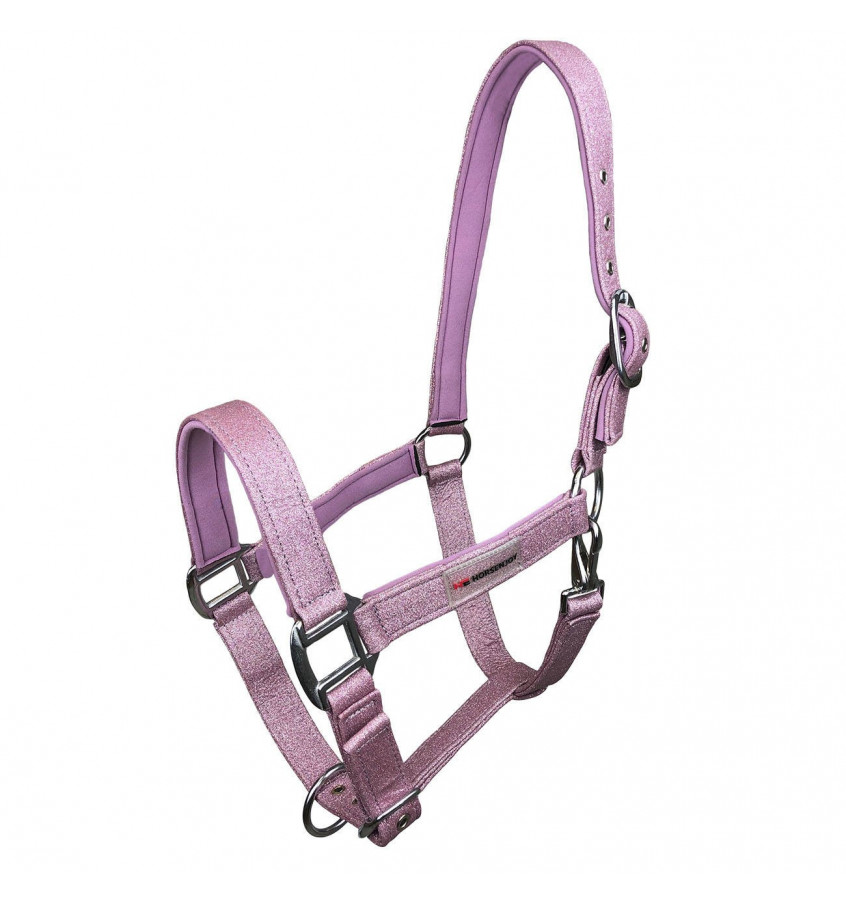 Elegancki kantar, który pięknie odbija światło. Ozdobiony brokatową taśmą. Podszyty miękkim neoprenem. Regulowany na nachrapniku oraz potylicy. Srebrne okucia.