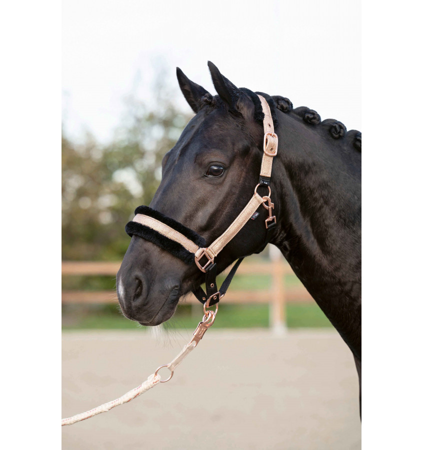 Piękny kantar dla konia pokryty brokatem. W newralgicznych miejscach podszyty miękkim czarnym futerkiem. Regulacja potylicy po obu stronach oraz regulacja nachrapnika pozwala na idealne dopasowanie do głowy konia. Okucia w kolorze różowego złota.