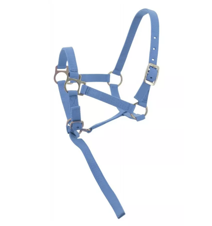 Kantar wykonany z mocnej taśmy nylonowej. Wyposażony w regulację potylicy oraz nachrapnika. Z krótkim uwiązem.