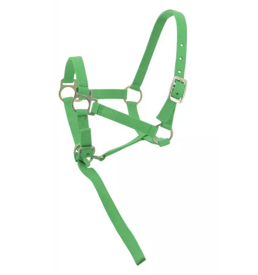 Kantar wykonany z mocnej taśmy nylonowej. Wyposażony w regulację potylicy oraz nachrapnika. Z krótkim uwiązem.