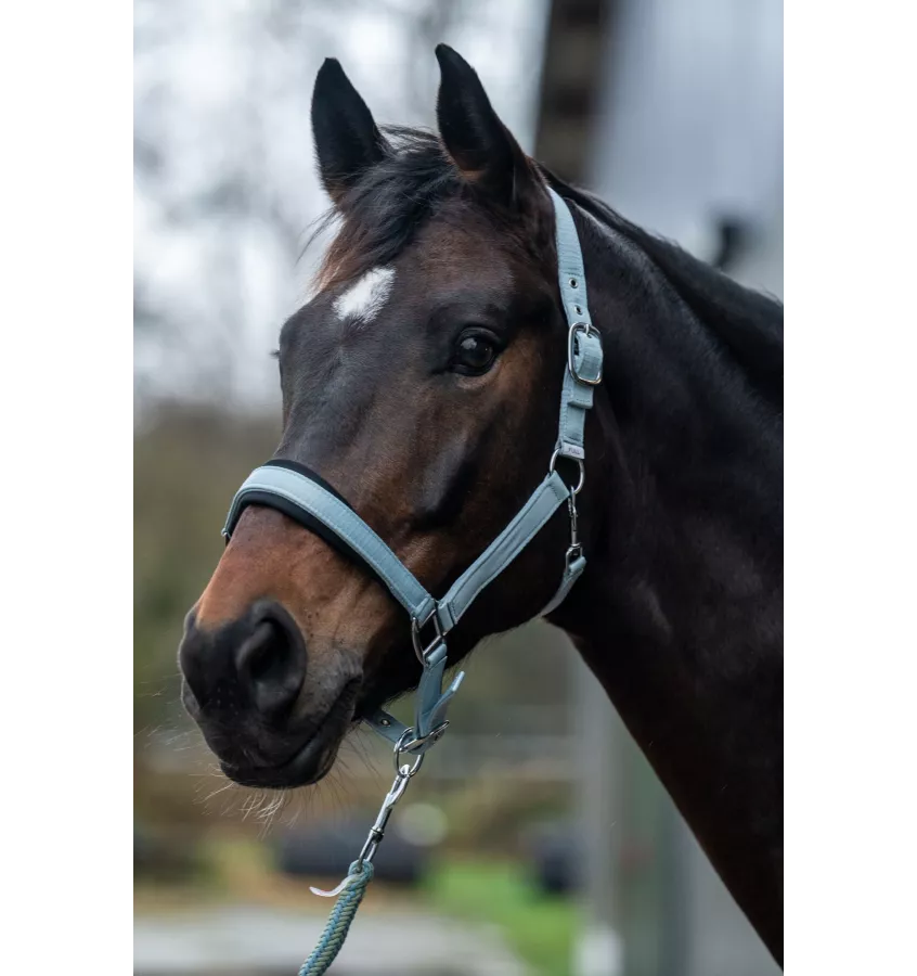 Piękny minimalistyczny kantar wykonany z taśmy o satynowym wykończeniu. Wyściełany miękkim softoprenem. Wyposażony w duży zakres regulacji.