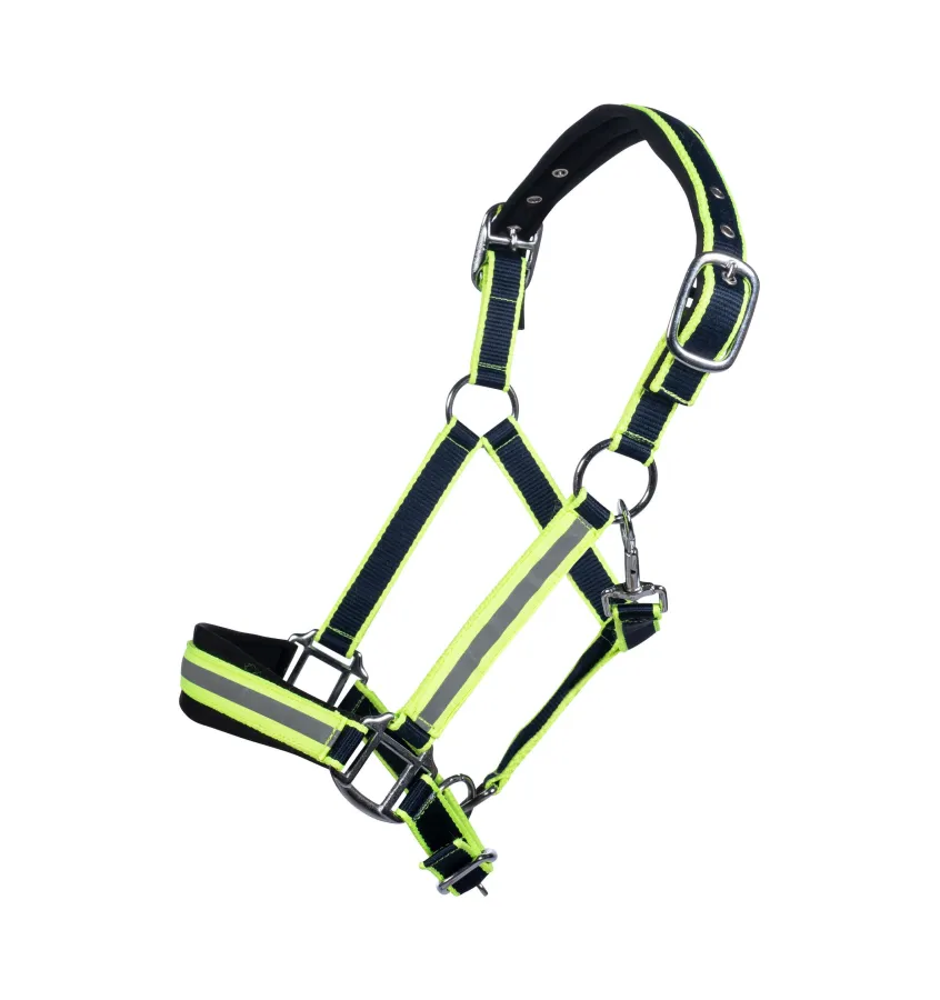 Kantar z potrójną regulacją w odblaskowym kolorze. Podszyty neoprenem w części nosowej i potylicznej.