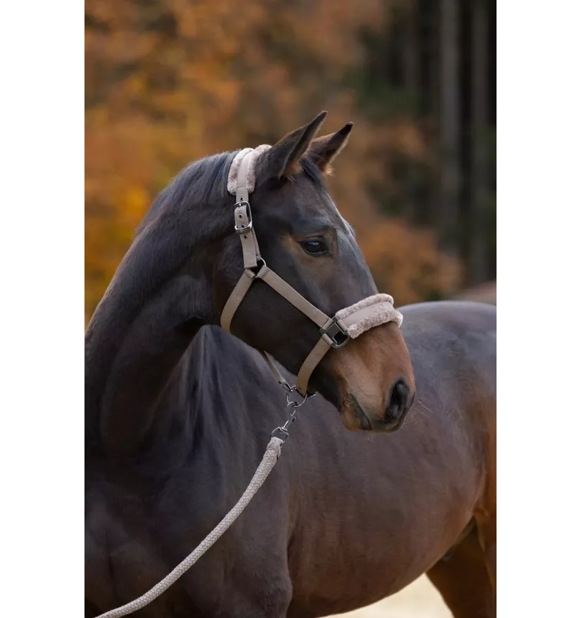 Kantar dla konia z futerkiem. Nachrapnik i potylica podszyte sztucznym futrem. Dwustronnie regulowane nachrapnik i potylica z klamrą szpilkową. Łatwe otwieranie i zamykanie kantara za pomocą karabińczyka. Solidne metalowe okucia