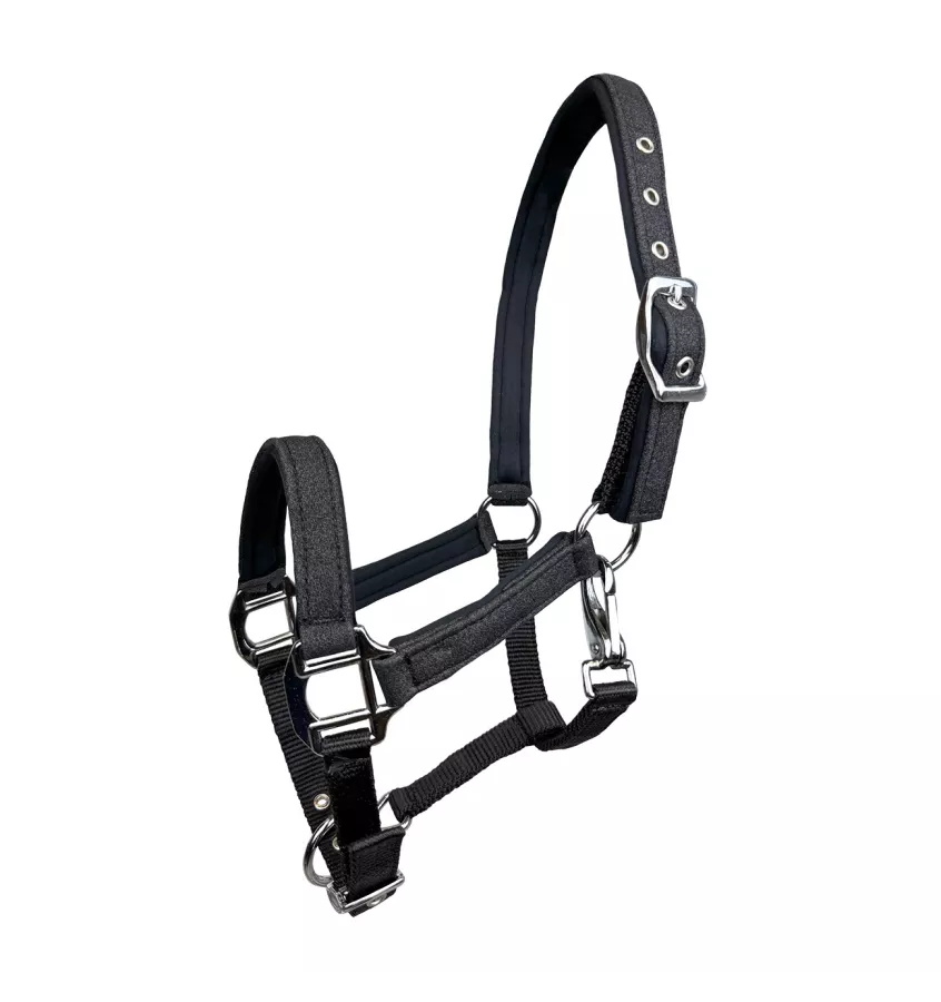 Kantar dla źrebiąt wyściełany bardzo miękkim podszyciem neoprenowym. Wykończony mieniącym się, brokatowym materiałem. Posiada możliwość regulacji przy nachrapniku i potylicy. Okucia w srebrnym kolorze. Gładko wykończony karabińczyk nie obciera konia.