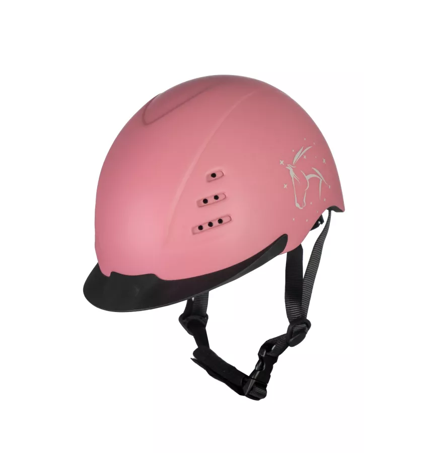 Kask jeździecki z możliwością regulacji obwodu. Kask posiada liczne otwory wentylacyjne z przodu oraz z tyłu. Posiada pokrętło regulacyjne z tyłu kasku. Wyposażony w miękką wyściółkę wewnątrz. Dostawa z woreczku materiałowym 100% poliester. Zdobiony nadrukiem z motywem konia.