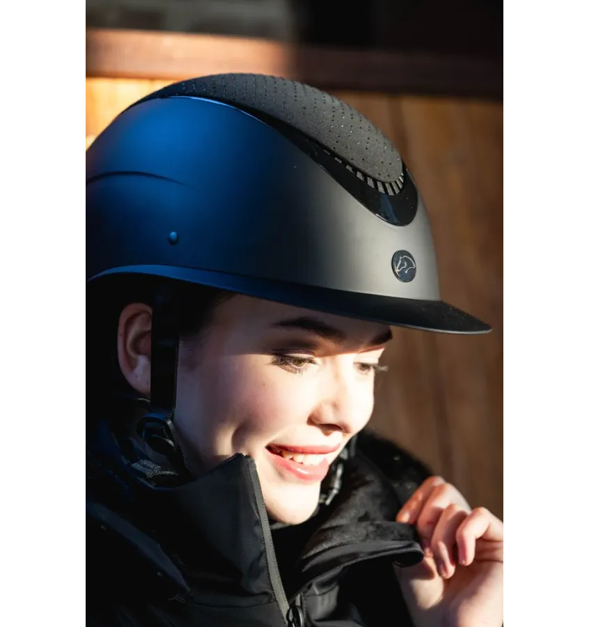 Kask jeździecki Alarion Diamond łączy w sobie bezpieczeństwo, komfort i elegancki design. Dzięki regulacji za pomocą praktycznego pokrętła, można go indywidualnie dopasować do głowy i zapewnić idealne dopasowanie. Otwory wentylacyjne zapewniają przyjemną cyrkulację powietrza, a błyszczące detale i lśniące kryształki nadają kaskowi elegancki wygląd. Kask jest dostarczany w wysokiej jakości materiałowym pokrowcu, który umożliwia bezpieczne przechowywanie. Kask jest zgodny z europejską normą EN 1384:2023, zapewniając niezawodną ochronę podczas każdej jazdy.