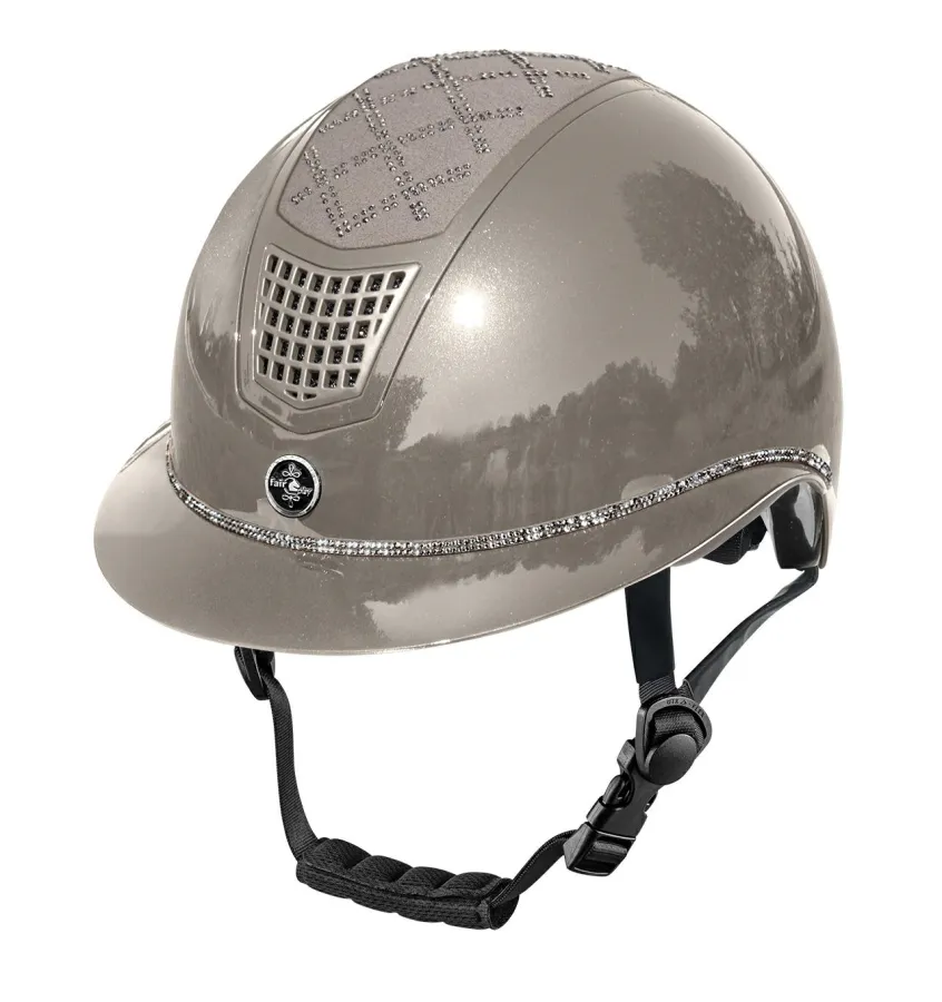 Nowoczesny, modnie wykończony kask jeździecki. Daszek oraz pokrywa kasku są lakierowane na wysoki połysk. Bardzo wygodny dzięki wkładce z pianki memory, którą można wypiąć i wyprać. Wposażony w pokrętło regulacji dopasowującej kask do obwodu głowy oraz 3-punktowy system regulacji pasków. Efektywny system wentylacji (otwory wentylacyjne z przodu i z tyłu). Wykonany z materiału o wysokim stopniu absorpcji uderzeń i wstrząsów, wspomaganego w tym dodatkowo przez opatentowane zastosowanie półkul absorpcyjnych w górnej części skorupy kasku. Posiada wzmocnienie przeciw naprężeniom przy bocznej deformacji